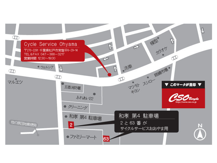 駐車場は五香消防署の信号を南へ曲がり、100m先左側の 「和孝 第4 駐車場」 2番と63番をご利用下さい。